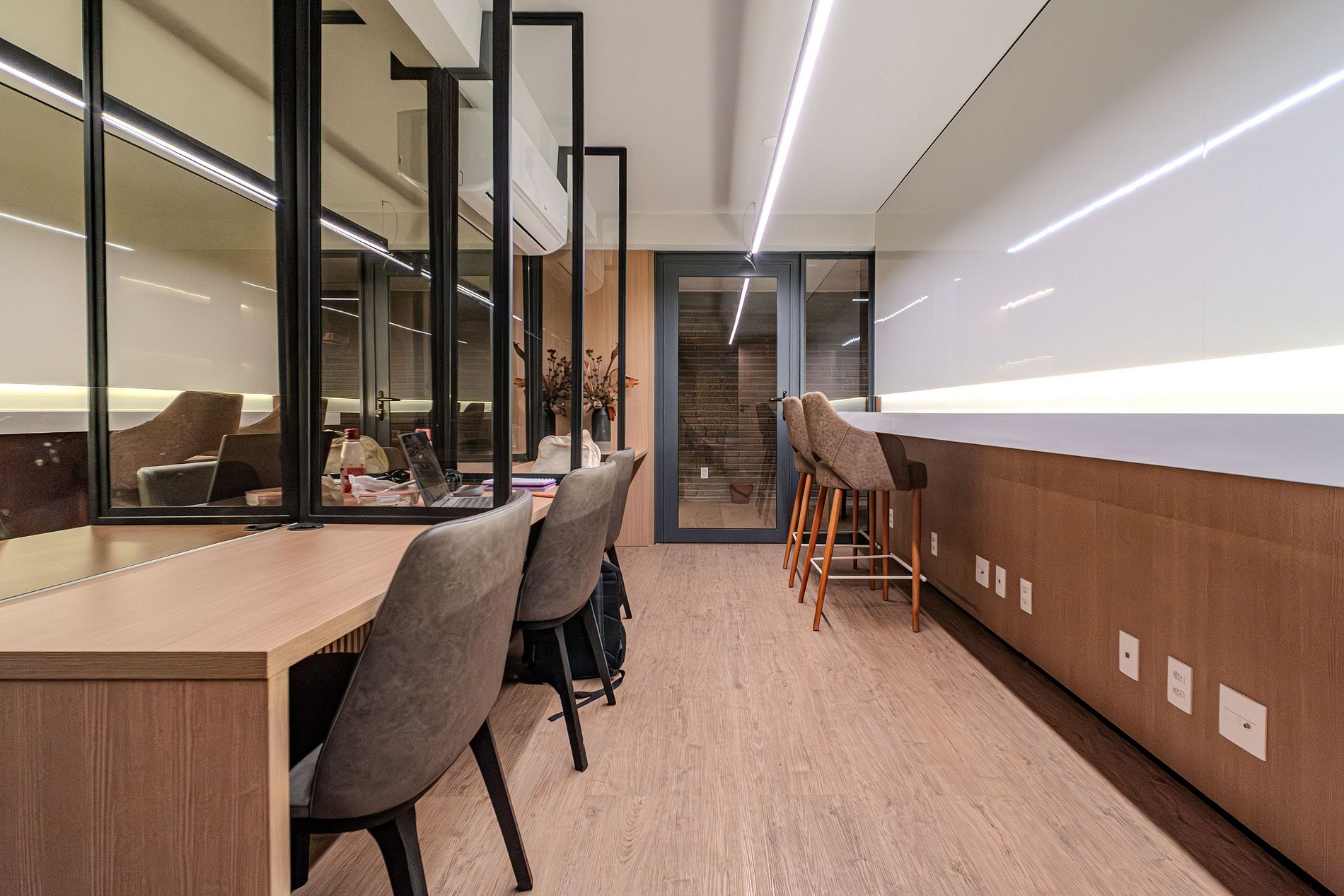 Espaço de Coworking com wi-fi, mesas e cadeiras.