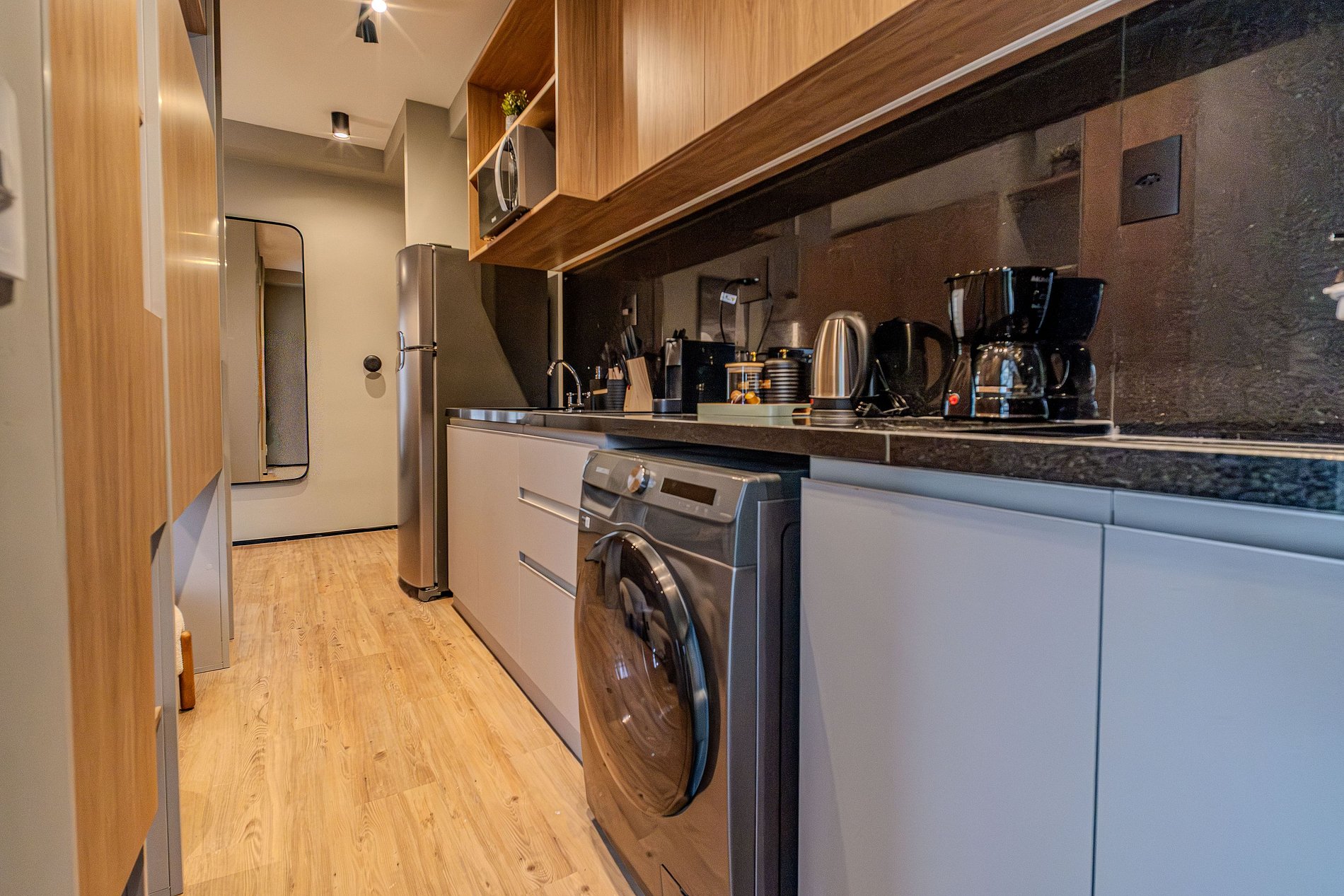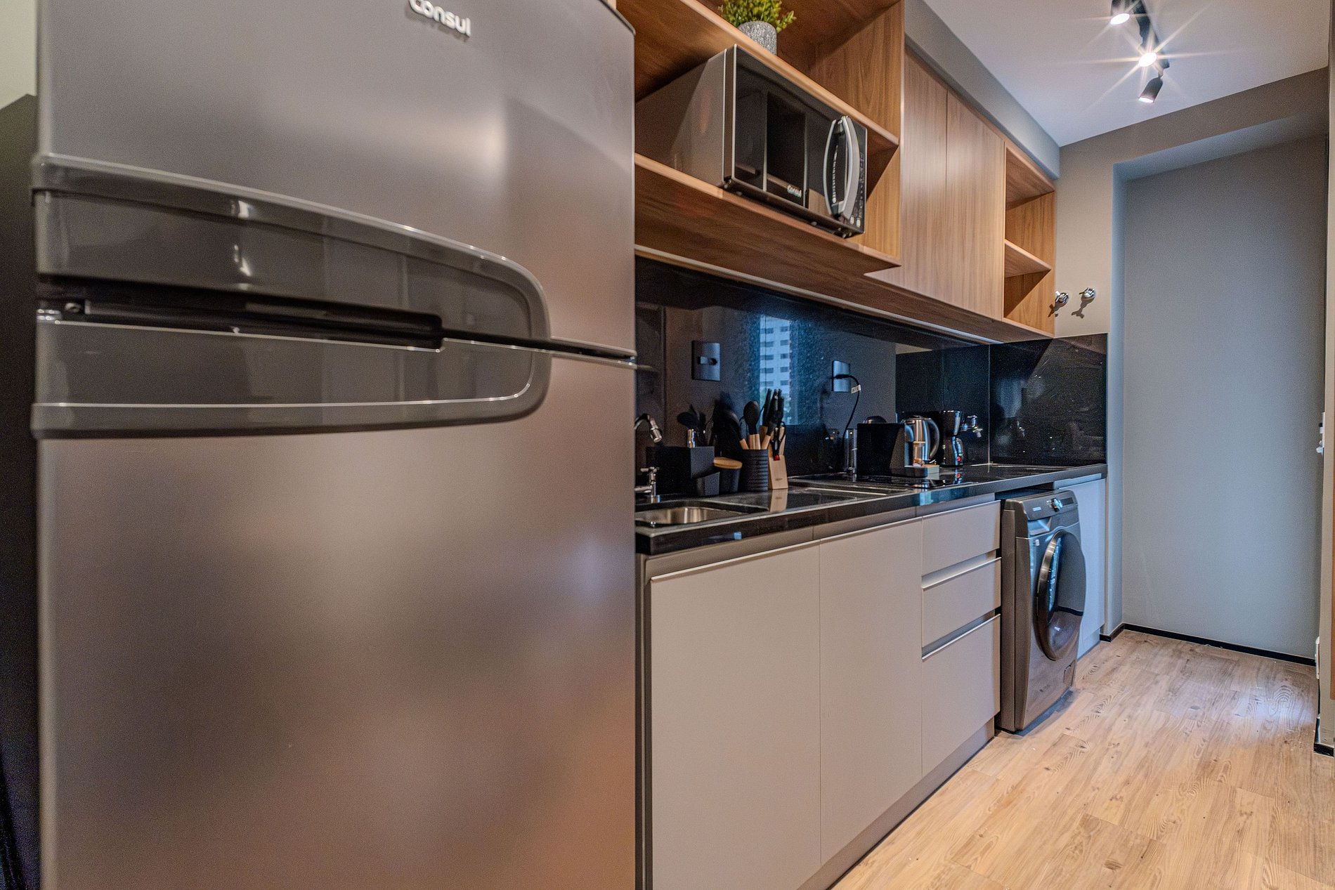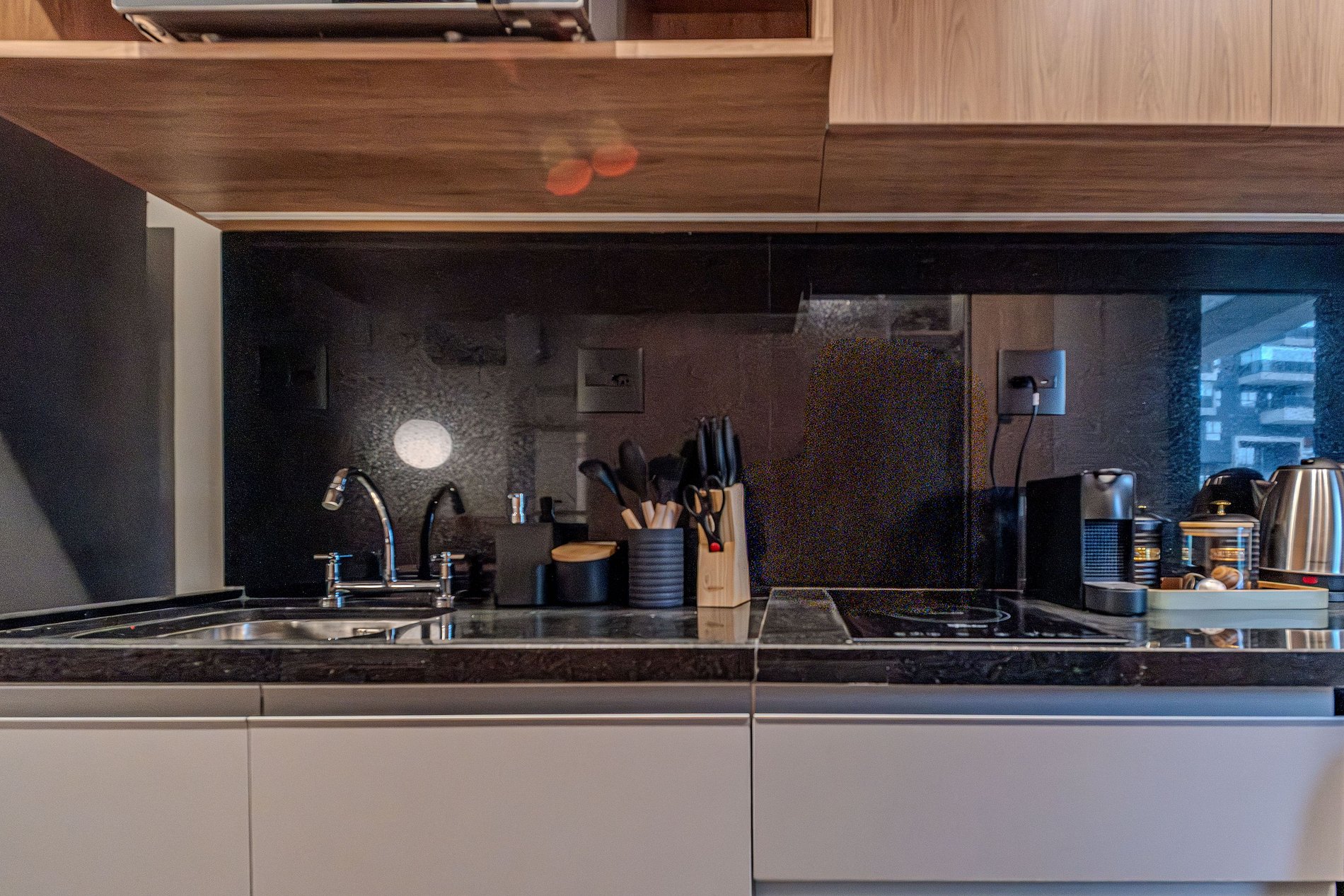 - Itens básicos de cozinha (micro-ondas, utensílios essenciais, cafeteira Nespresso).