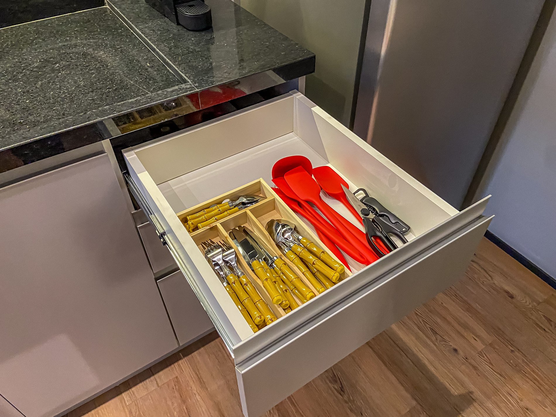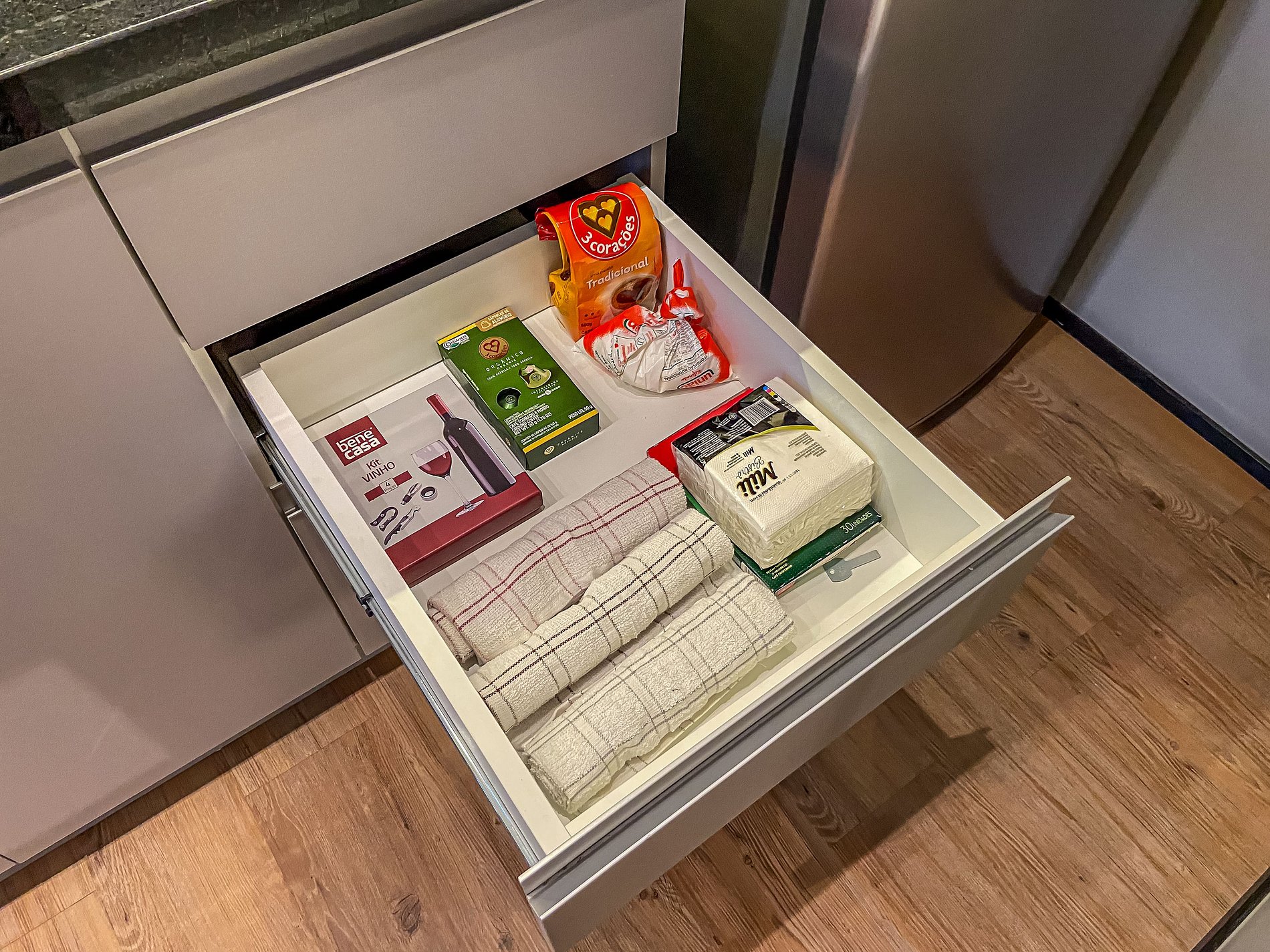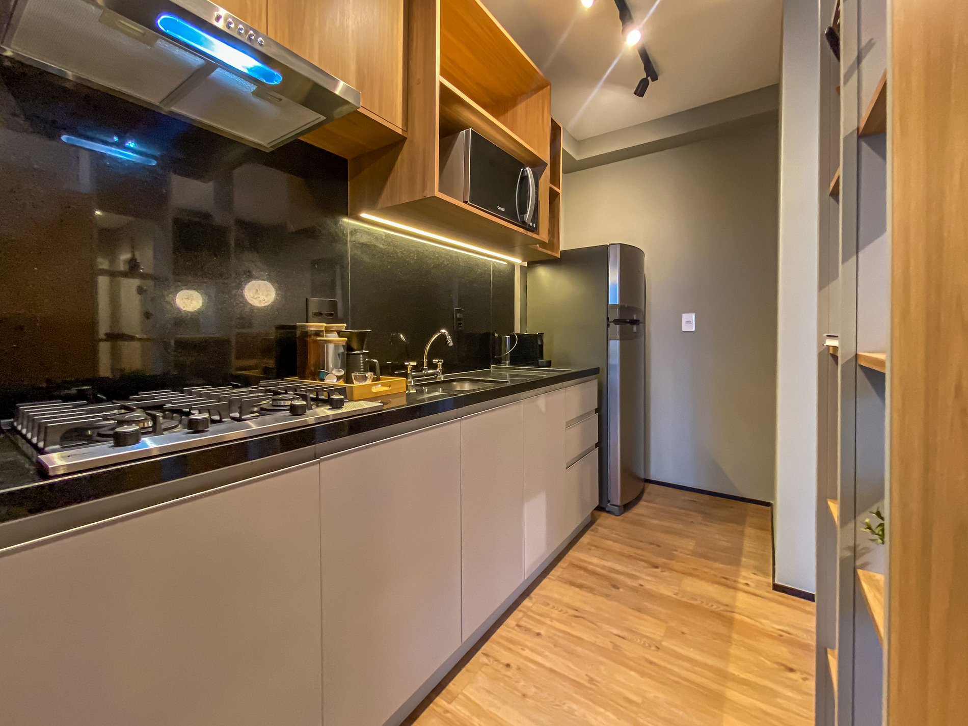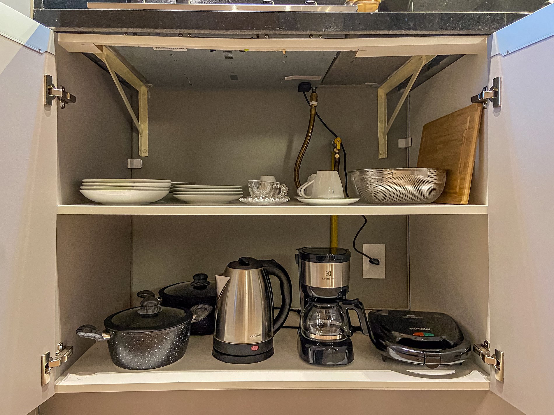 - Itens básicos de cozinha (micro-ondas, utensílios essenciais e cafeteira Nespresso)