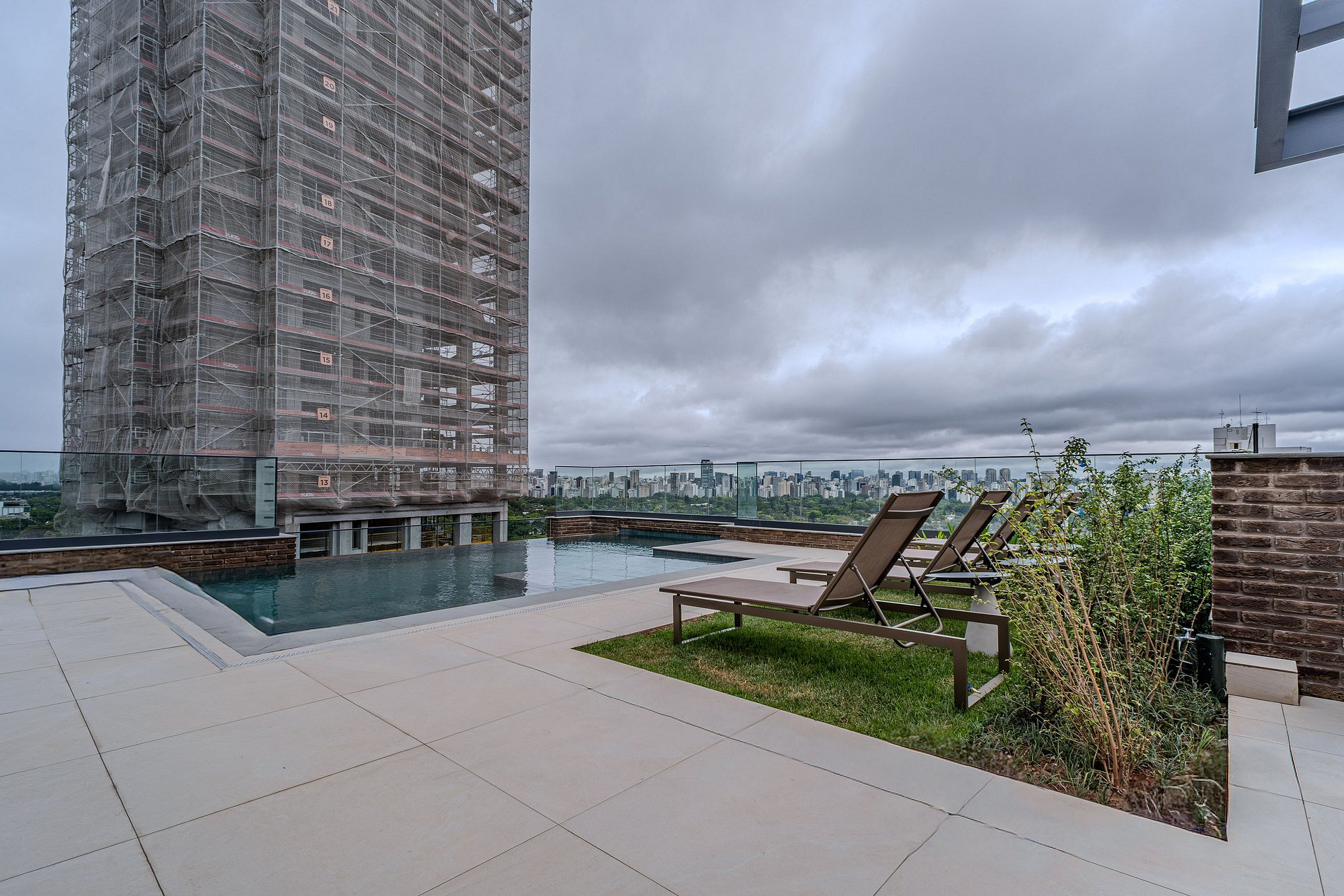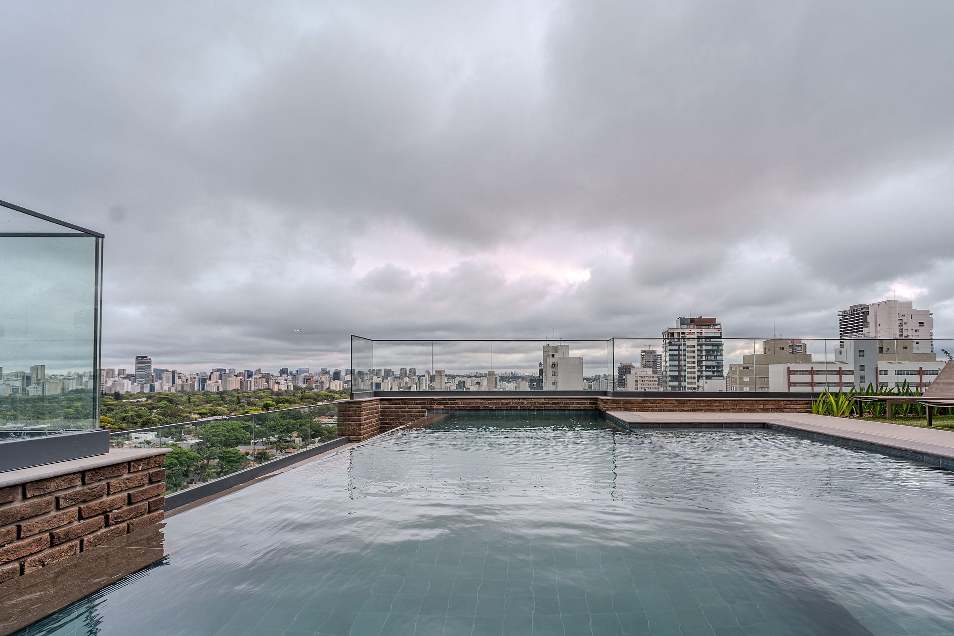 Piscina com borda infinita e solarium.