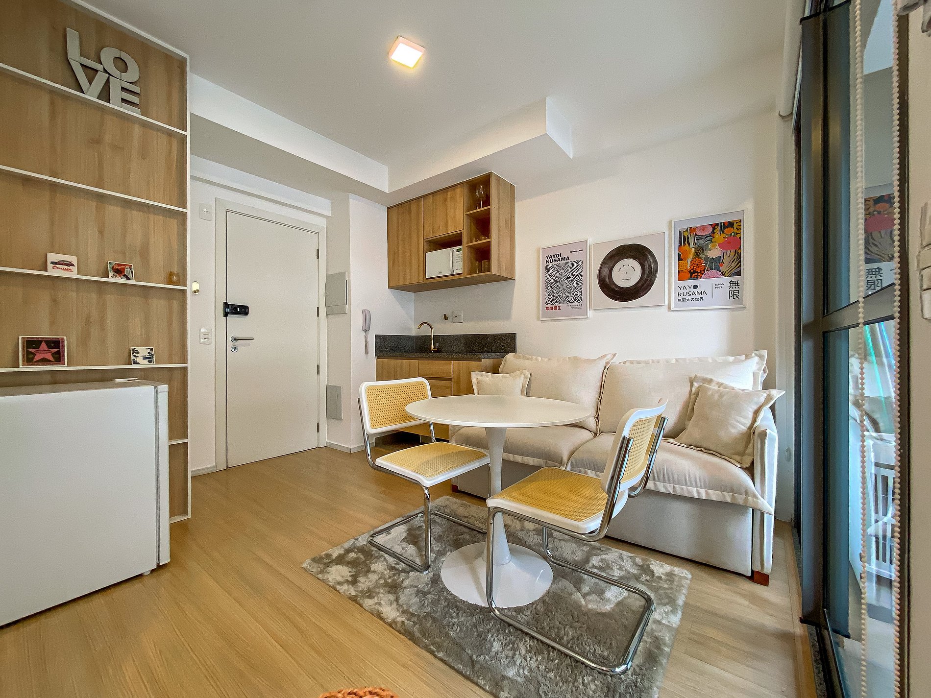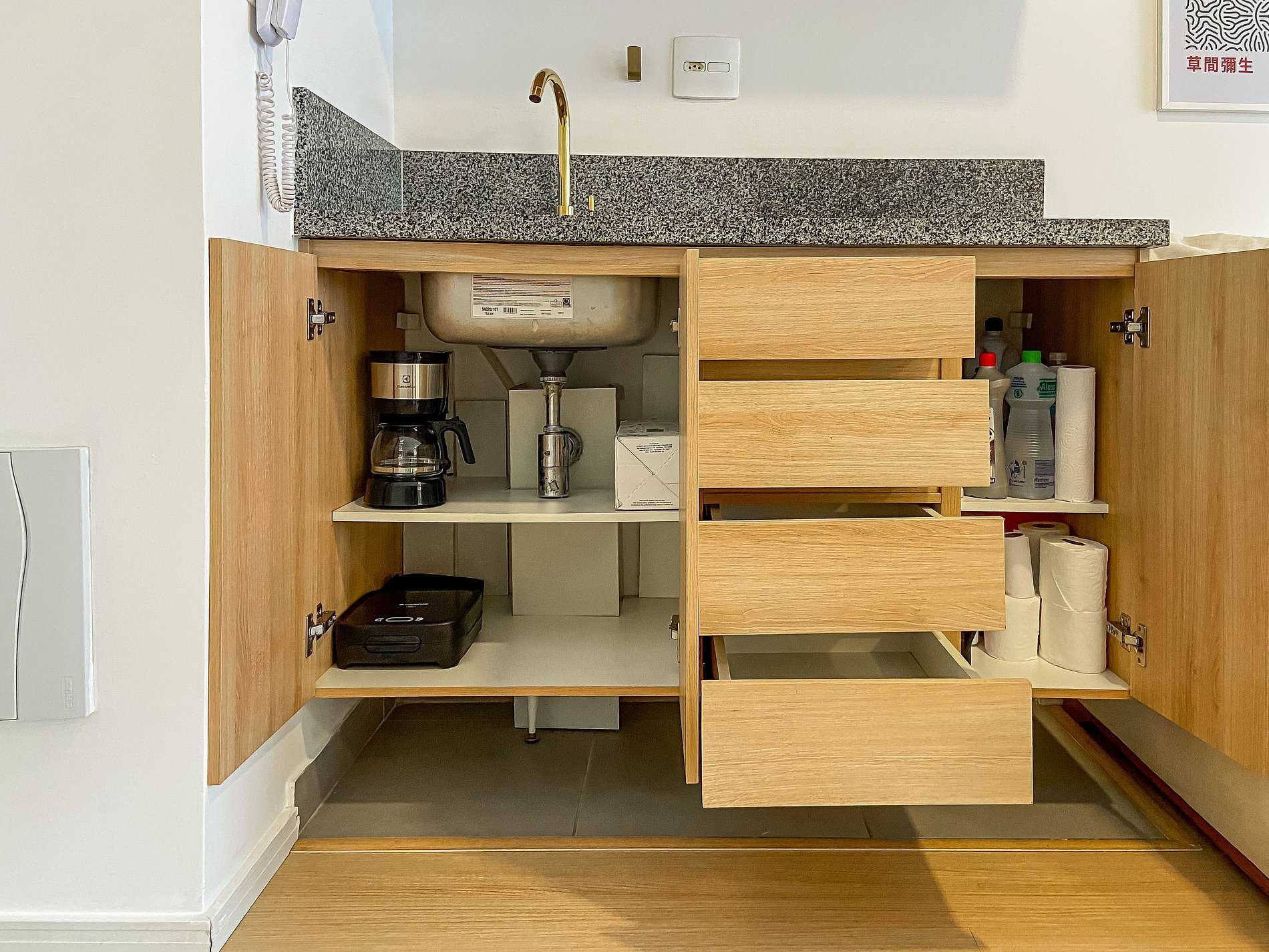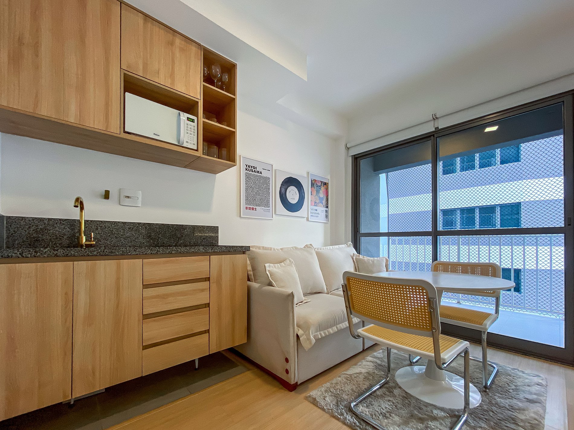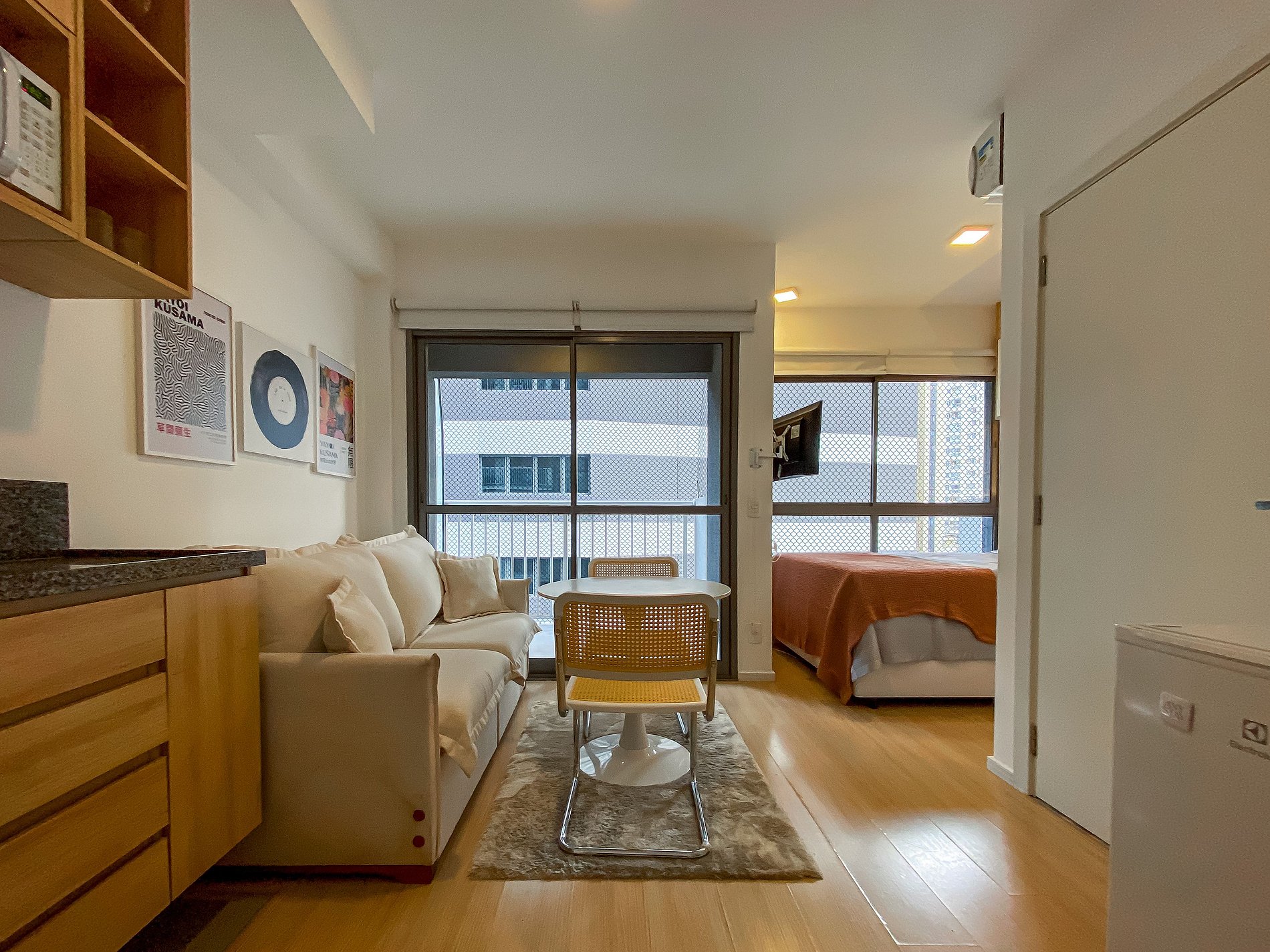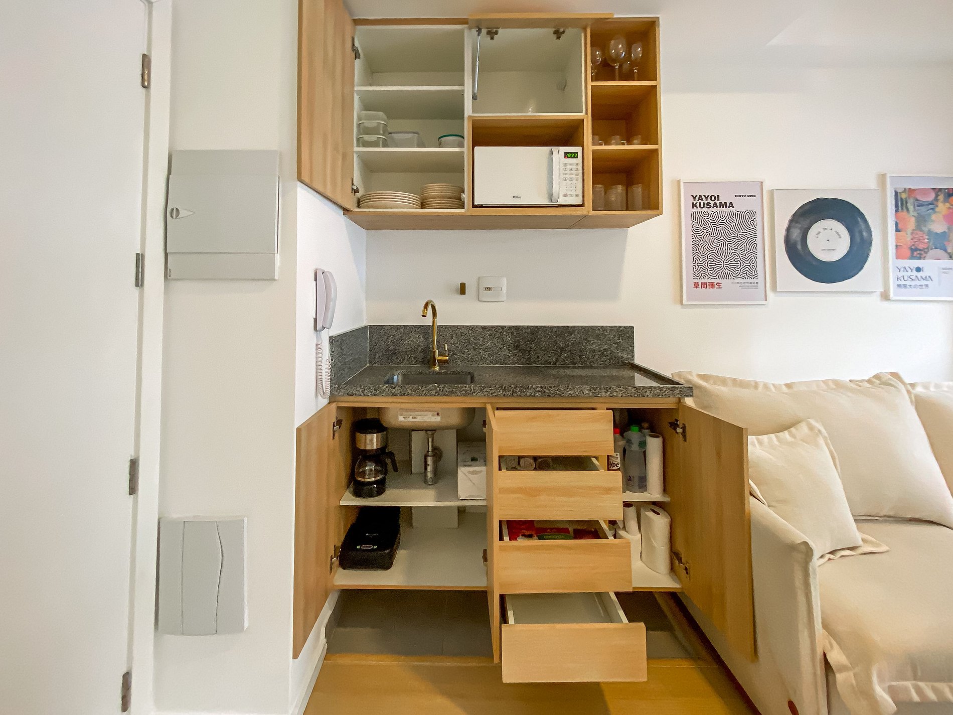 - Itens básicos de cozinha (microondas, utensílios essenciais, cafeteira Nespresso, frigobar)