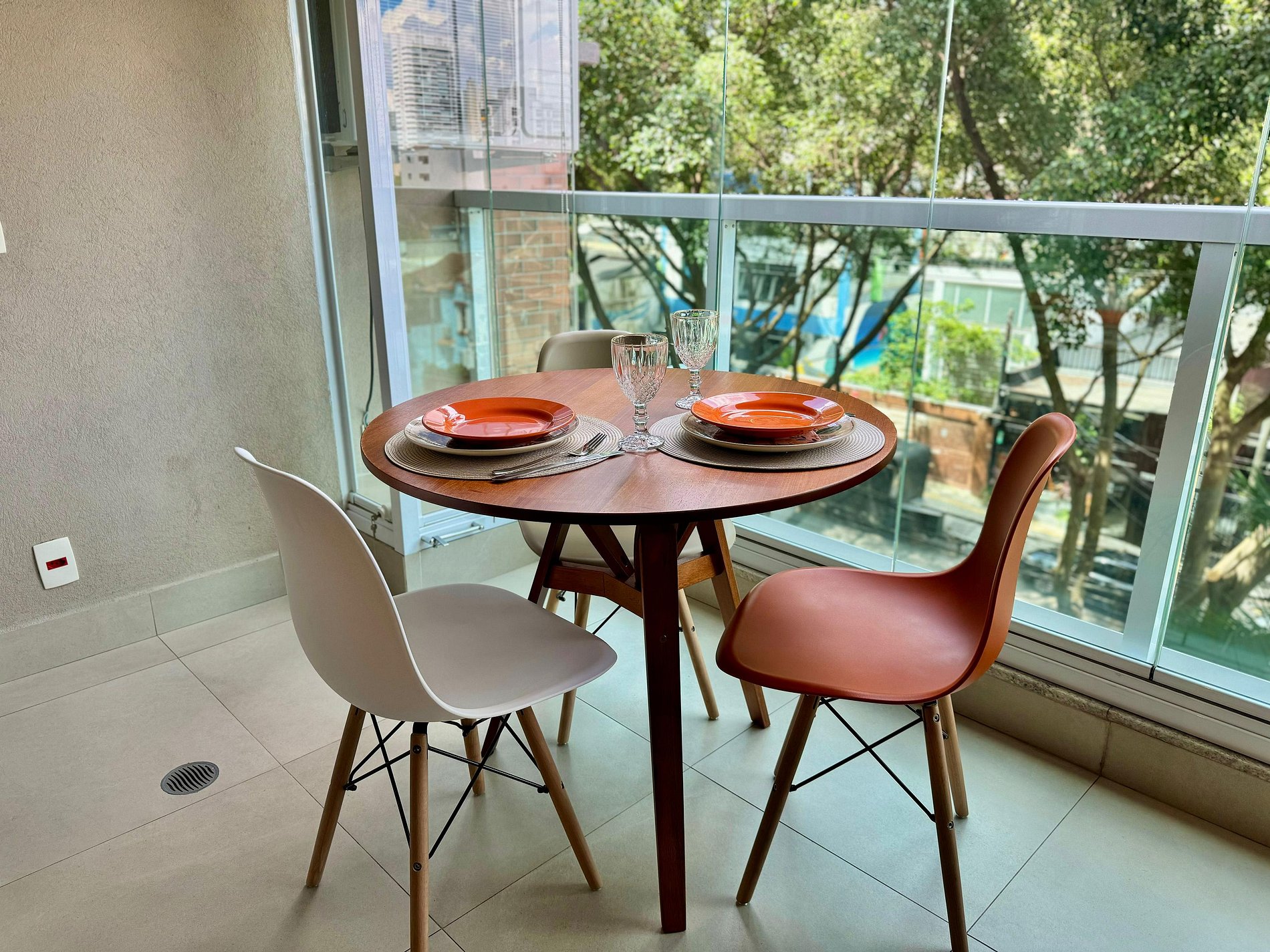 Espaço muito bem distribuído com uma área para trabalho em uma varanda aconchegante e arejada, vista interna para o condomínio o que garante mais silêncio em meio ao bairro movimentado.