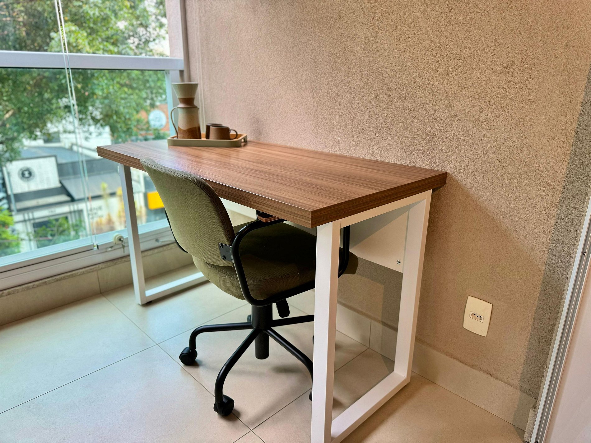 Espaço muito bem distribuído com uma área para trabalho em uma varanda aconchegante e arejada, vista interna para o condomínio o que garante mais silêncio em meio ao bairro movimentado.