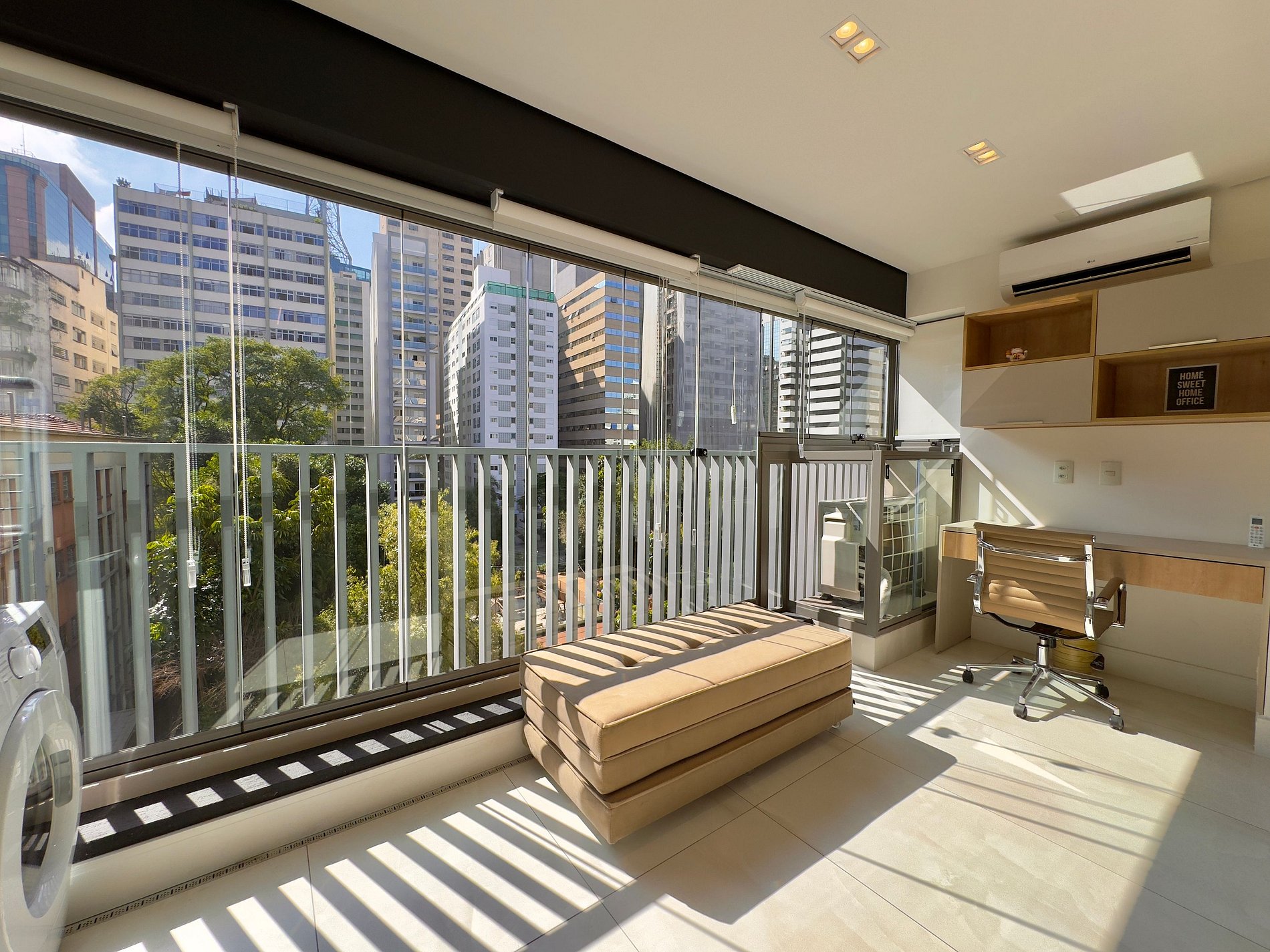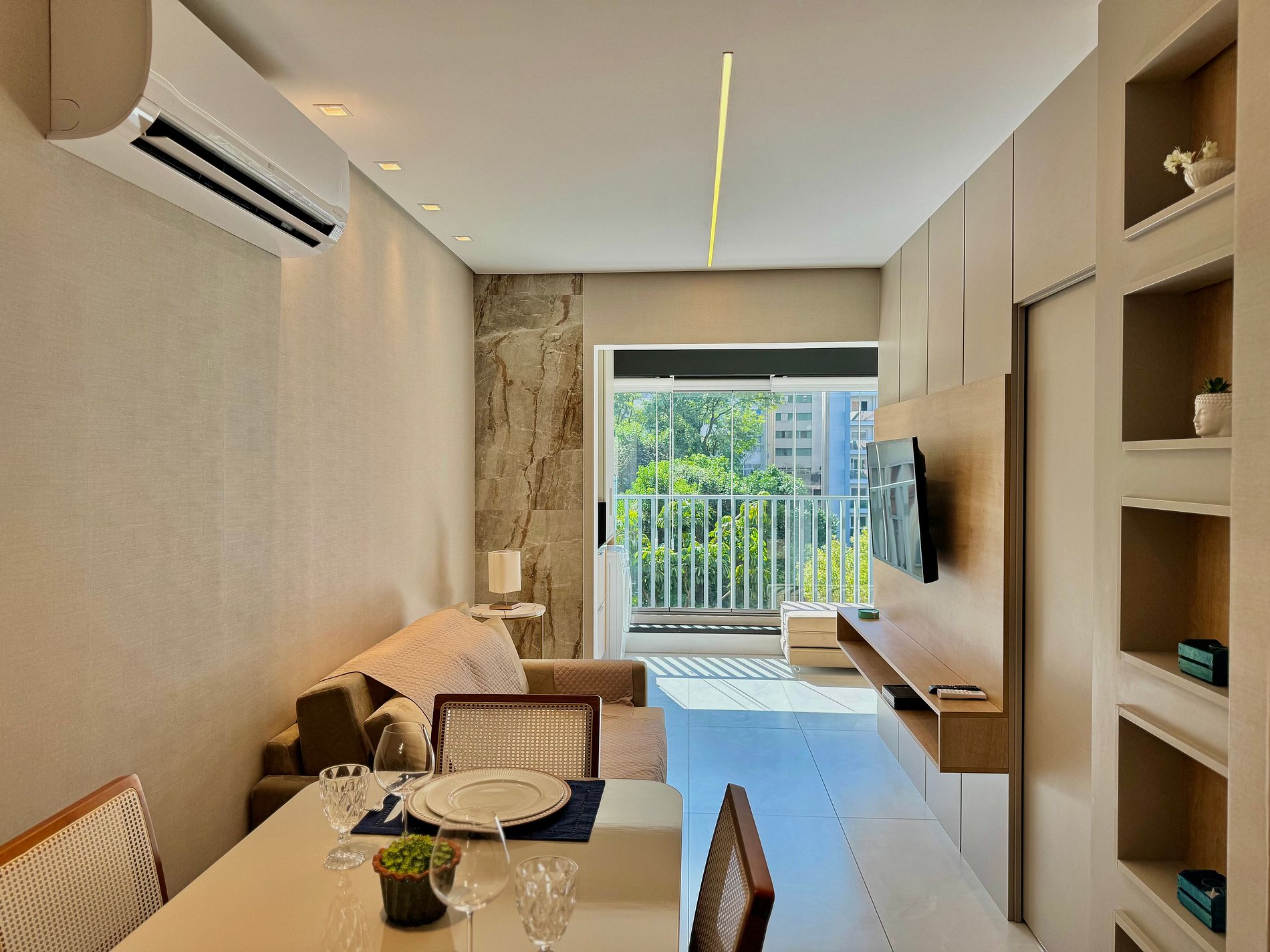 Apto novo, reformado por arquiteto e com detalhes de acabamento de muito bom gosto, como mármore bege, piso em porcelanato e ar-condicionado em todos os cômodos. A vista para o parque interno, com sol da manhã na varanda, possibilita um café da manhã com ar de interior, enquanto o ambiente silencioso completa o charme e o bem-estar que este apartamento oferece. O apartamento conta ainda com máquina de lavar, trazendo mais praticidade à sua estadia.