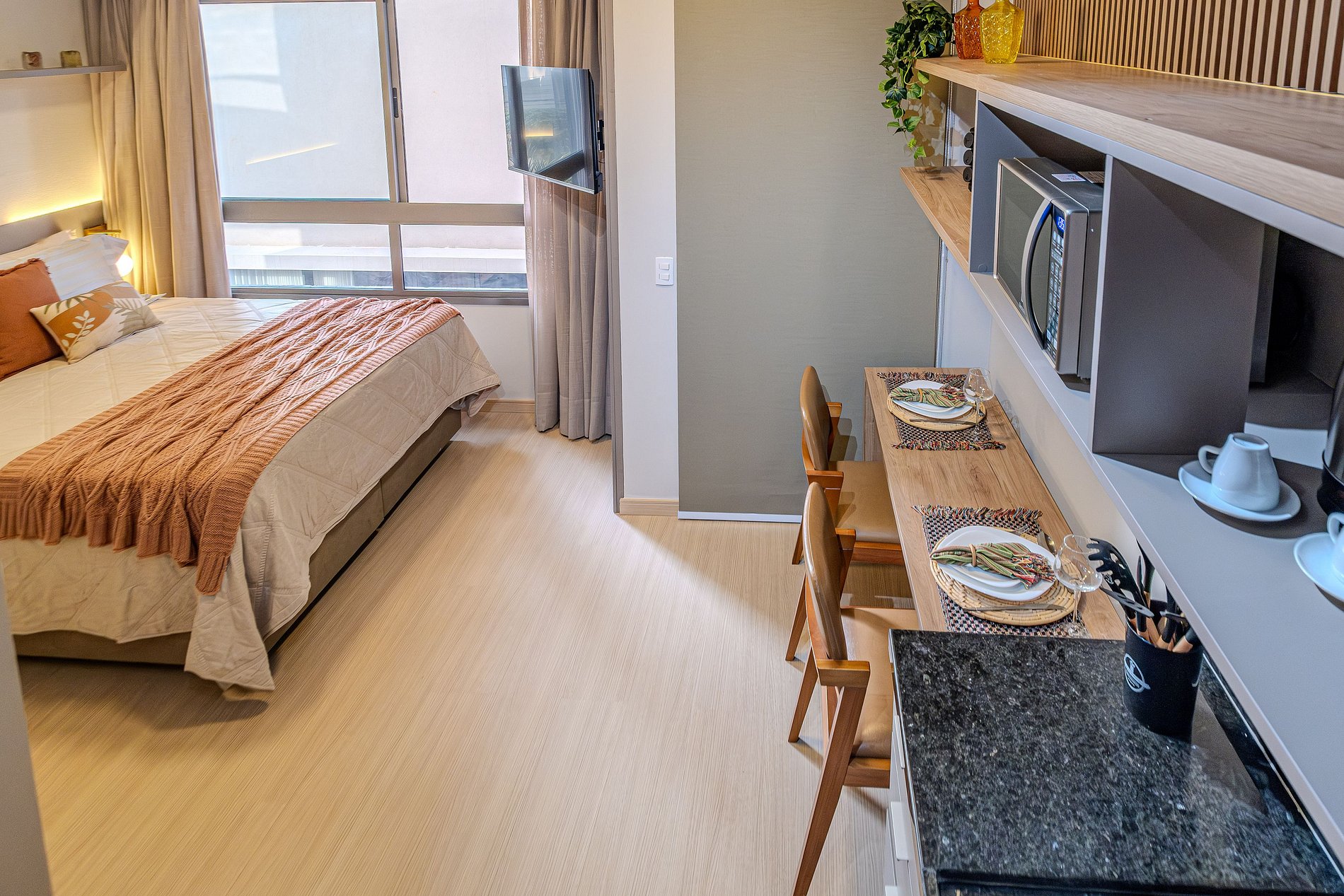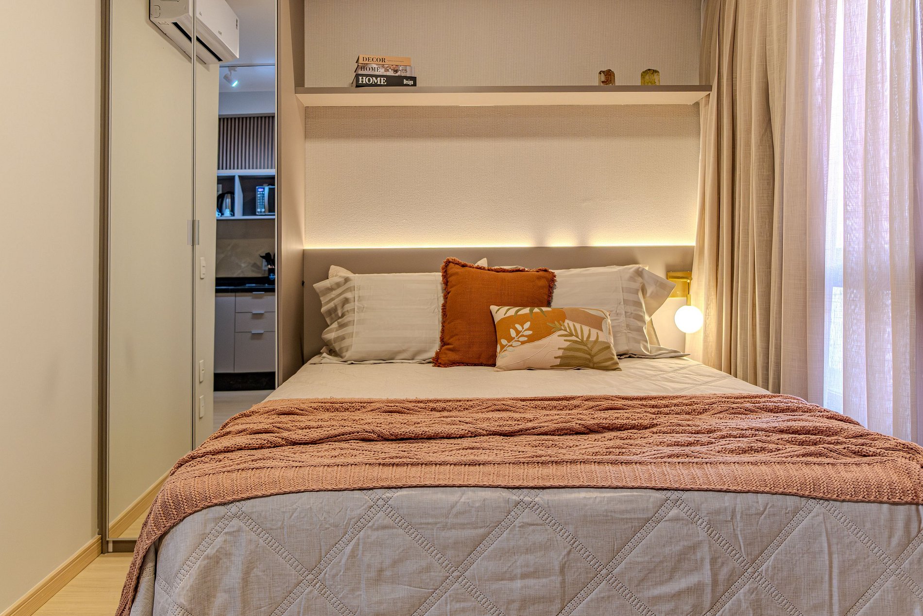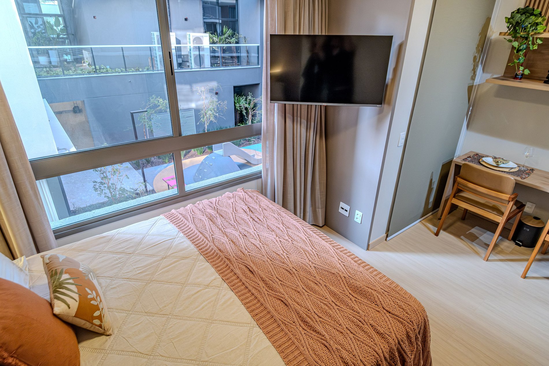 O apartamento foi recém decorado, de forma detalhada com muito bom gosto, buscando oferecer conforto com colchão queen de excelente qualidade, roupas de cama com lençóis 100% algodão 400 fios e toalhas de fio egípcio. Possui cafeteira, secador de cabelo, tv smart, wi-fi e cozinha totalmente equipada além de estar muito bem iluminado para proporcionar estadia agradável e acolhedora.